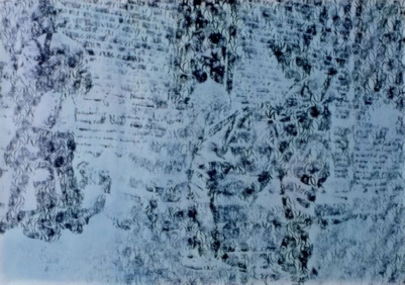 Le rouleau gravé de caoutchouc s’alimente de peinture et la réserve perpétuelle permet de légères variations de densité colorée, marquant de ses irrégularités le support sensible.